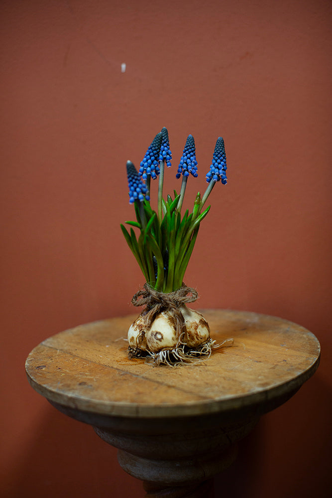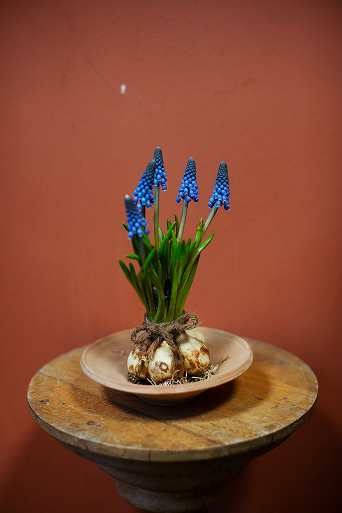 Muscari bulbs, commonly known asGrape Hyacinths, are easy-to-grow, hardy, spring-flowering in to blue, grape-like clusters. These will be sold with a terracotta dish (as pictured).